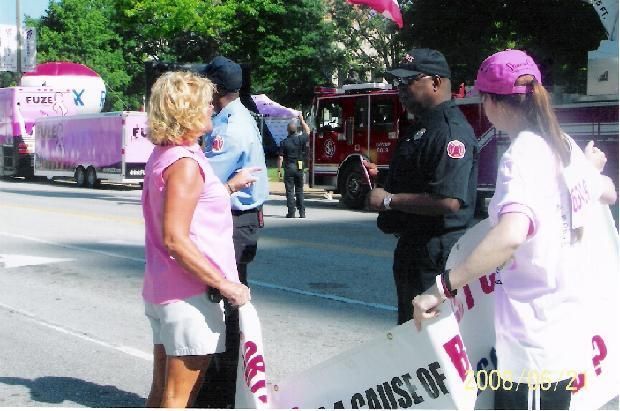“I’m not here selling you a bag of goods. Please do the research yourself. We’re here to let women know there is a link between breast cancer and elective abortion. Why aren’t women being told? Learn for yourself. Go the website and educate yourselves and tell others. You know years ago, the slave owners said Negroes were property and slavery didn’t exist. It took abolitionists and a war to expose the truth.” The police officer moved in closer. The fireman agreed with us.