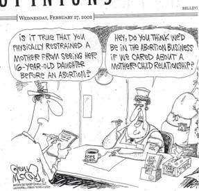 Why would the ACLU on behalf of feminist, pro-abortion doctor Allison Cowett of Chicago, IL join forces with the Hope chop-shop notoriously known as the Midwest’s largest, late-term abortion mill, where no parental consent is necessary and is the dumping ground for underage abortions here in Granite City, Illinois? Just follow the money trail. Isn’t the ACLU run by the same liberal mentality and character as ACORN? I believe it to be true. Why would you file a lawsuit after a federal court has already enacted the 1984 parental notification law in Illinois , which has been updated and stalled in the courts since 1995, just two weeks before it is to be enforced throughout Illinois abortion mills? Because it tells the public that the ACLU and Hope Clinic think they make better parents than those that are caring for and footing the bills of their underage teens. They have taken parents’ rights out of their hands for approximately 2-4 hours with each underage abortion, then kick the teens to the curb for their parents (who bear the responsibility in rearing them) and for society to deal with. Get the picture?