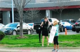 As peaceful prolifers were physically attacked by attendees. Mosaic PHC executive director unleashes supporters to take our signs and harass peaceful protestors. Complaint has been filed with local police department, who came earlier on a false complaint that protestors were "rioting", of all things. Truth is hate to those who hate the truth. Just when you think the American church cannot sink any deeper, it does. As the attendees pulled into the parking lot, several began rolling down their windows and cursing us, or we received a few middle fingers, many had Christian symbols on their cars. One pastor in a red Cadillac, tried to run us over as he gunned the engine and steered his car inches, not feet, in front of where we stood. Most were older and some 40-50ish supporters. One sign read "You didn't help me or my baby" another "Mosaic's policies kills babies." You see, this pregnancy center makes it so hard for pregnant girls to get any assist or an ultrasound, that many cross our paths at the GC ab mill. We have been exposing this problem a long time in GC but, this pregnancy center takes in a million $, a year and gets government grants. The exec. dir. pays herself 80k a year and does very little to help pregnant girls. Most of their revenue goes toward furniture, fundraising events, and salaries. Less than 5% goes directly to helping pregnant women or their babies according to their income report. Other employees don't have to list their income according to non-profit report. This prego center has a $400.000 med. mobile unit, complete with ultrasound, and only leaves their lot for fundraising views, from donors. We have asked Mosaic to please let our ministry have the van if they are not going to be good stewards of God's blessings. Lord knows the repairs and upkeep we have endured over the years in our out dated van. Our appearance must have incited a couple (fem-black coat& male-blue shirt) as they left their red BMW in the middle of the parking lot and doors opened as they charged towards the protestors across from me. They picked on a young man. They shoved him and took their camera inches from his face and screamed at him to "answer them", "why can't he talk?" the irate woman kept screaming as she shoved her camera in his face.
