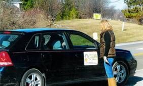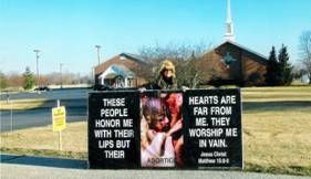 Many cars stopped to look and read our signs. We received several honks and thumbs up. Only one young woman, probably prochoice, gave us the middle finger. Members of this church had obviously been given a heads up and tried to avoid the signs, but they couldn’t help but look as they turned into the parking lot for services. One woman pulled over and wanted to know more. We gently informed her of the heresy. She was appalled. She encouraged us to keep the faith and keep exposing churches like this one and the wolves in sheep’s clothing. She went on to say in the end times the Bible tells us that it will be a small remnant that stands alone and changes the world. So true.